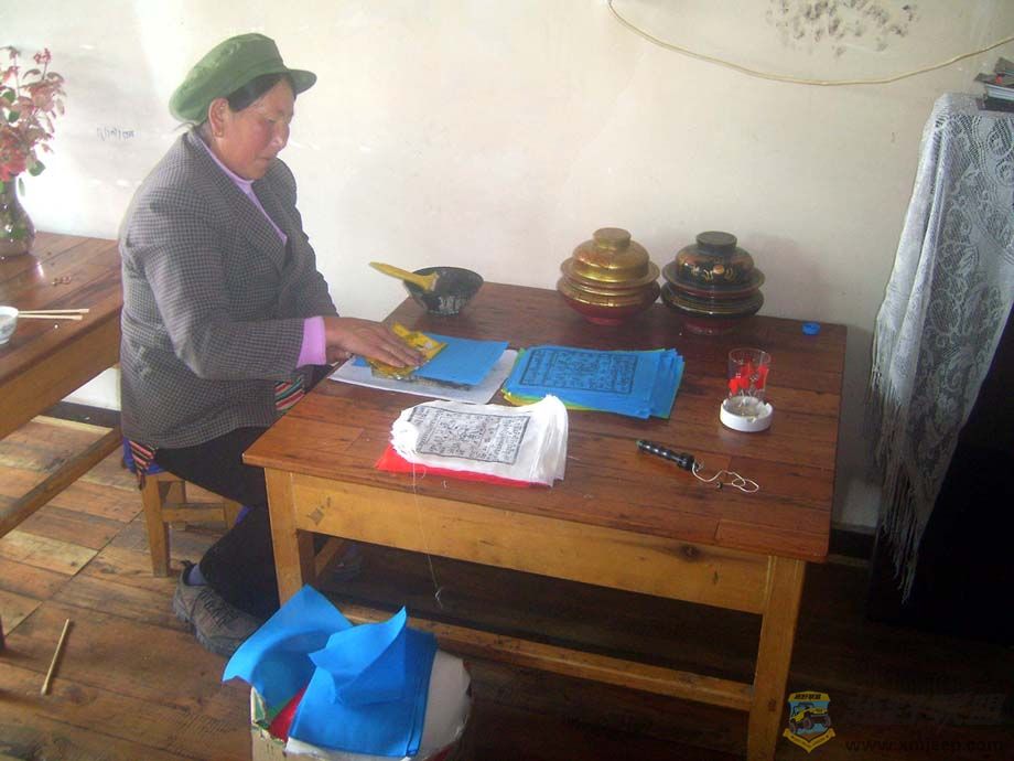 凄风冷雨,室外蛮冷的,客栈老板徐茸拉姆热情地招呼我进来与她们一起烤火。熊熊的火炉上热着酥油茶罐,徐茸拉姆问我酥油茶喝得惯后,笑着说不用钱的,为我倒上满满一碗。徐茸拉姆的母亲坐在火炉边刷印着五色的经幡,看到我酥油茶喝完了,笑着又为我倒上一大碗,最后,我一口气喝了四碗,喝得我整个身子都暖洋洋的。原来整个飞来寺只有这一家卡瓦格博客栈是正宗当地藏人所开的,主人一家人都很善良、热情。起码在我询问过的不少家客栈、宾馆中,这一家的开价是最低的,而且房间也比较干净和干燥清爽。我特地叫主人拉姆要了卡瓦格博客栈的电话,13988709398,徐茸拉姆(叫她拉姆就行了),标房80元/晚、普间20元/床,特向驴们推荐,有免费的酥油茶喝喔。