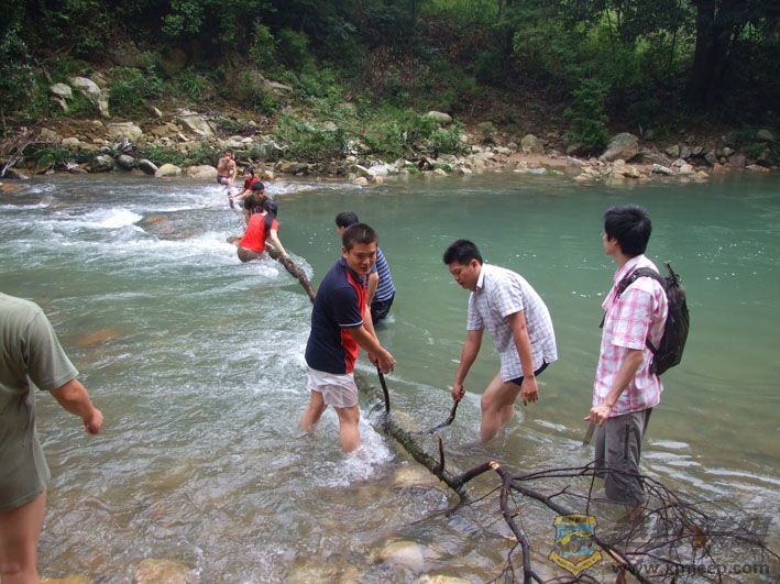 02走了几百米后,溪水把路冲断了,想继续前进,就要涉过一段很急的溪流.但一不小心就会被冲走,唯一的办法就是搭桥.