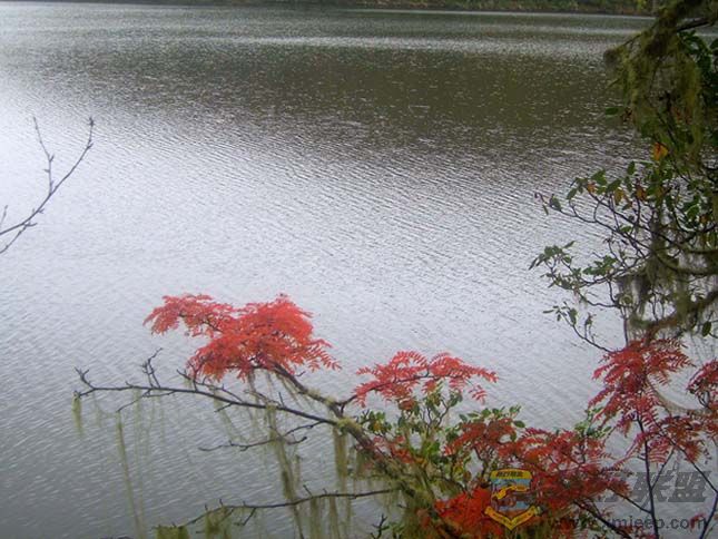 2 ?& F% {: `( W沿着湖边木栈道绕湖而行,一边是暗绿色的湖水,一边是已经换上红黄相间的秋装的山林。木栈道上飘洒着红色或是**的落叶,挂在树上的松萝在风雨中飘扬,可爱的小松鼠竟然跳到我的鞋面上与我对视。以前多次看到过松鼠,但如此零距离还是头一回,这一刻,我真切地明白了人和大自然和谐统一的真正含义。尽管雨絮一直在飞舞着,光线暗淡,我们还是在属都湖拍照、留连了近三小时,细心体验高原深秋的湖光山色。