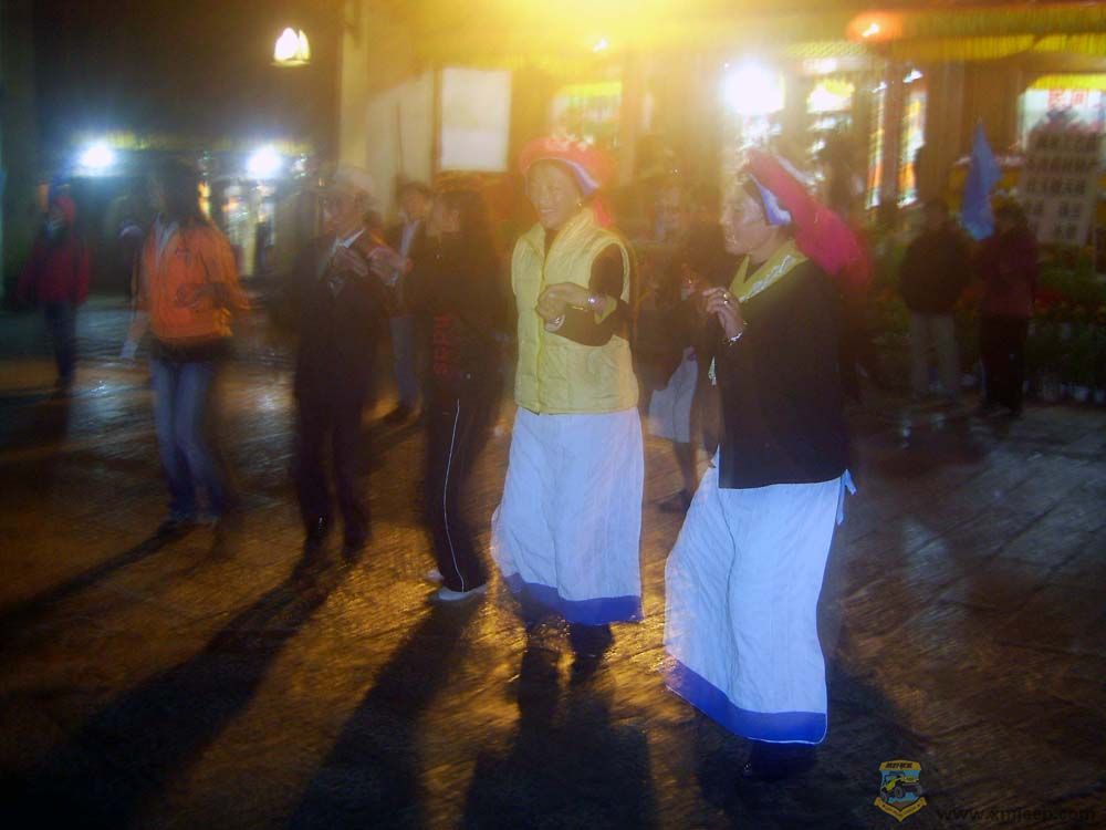 6 k3 P! R+ Q: R, @傍晚,我们在四方街旁边找了家小饭馆吃晚饭。下着小雨,挺冷的,看到在店里吃饭的当地人围着个小火炉取暖,我就厚着脸皮向他们讨要火炉。他们倒也爽快,二话没说就把火炉让给我们,好人喔。我们把火炉放在桌子下,好暖和啊。小饭馆的菜价比酒吧便宜了三分之一,驴子们在中甸古城吃饭还是尽量找这些小饭馆合算。吃完饭,雨也停了,四方街上歌声响亮,许多人围成一个大圆圈正欢快起舞。尽管我舞姿难看,但听到如此轻快的乐曲,我也按捺不住了,和二位女侠及其他不少中外游客一起加入其中,尽情地群驴乱舞了。