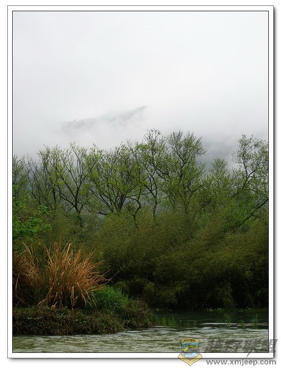 下山后,开始今天的重头戏,竹筏漂流。迎着蒙蒙细雨,四张竹筏一字排开,顺流而下,坐在竹筏上悠然自得地欣赏着两岸风光。听说如果夏秋季节到来,两岸连片绽放的芦荻,或白洁或粉红,在青山绿水的映照下,在古桥老屋的衬托下,说不尽的诗情画意,可谓是: