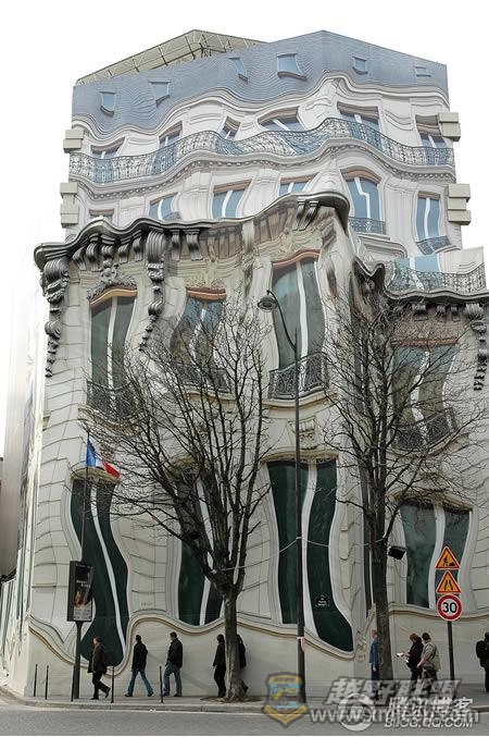 / y# R9 H$ a2 t+ V+ j9、这看起来十足像是经过处理的照片,其实是一所巴黎的建筑,像印在画布上一样,并加强了浮雕效果。该中心是2007年在Hausmannian大楼基础上的翻修。这个被称作39GeorgeV的工程是一个城市超现实主义宣言。