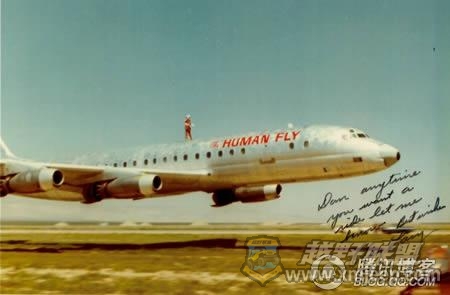 6 g) V2 m, y* y& h( ?& J( E10、人类的飞翔!飞机上的人叫Rick Rojatt,是一个魔鬼特技表演者。他想要在一架飞行高度低于250海里的DC-8巡航机上当一把漫画英雄。克雷·莱西驾驶这架飞机参加加州莫哈韦的飞行比赛。