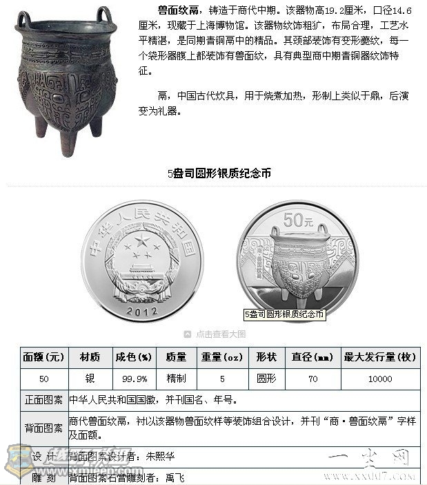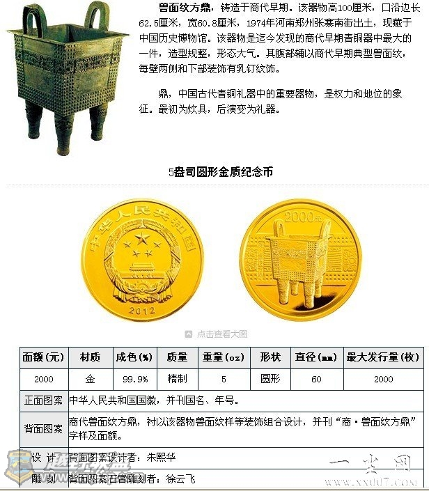 8 |5 p0 Q' H3 U6 { 此次发行的青铜器第1组纪念币规格有5种,含金币2枚、银币3枚;图案正面由国徽、国号、年号组成,背面分别由兽面纹方鼎、乳钉纹爵、兽面纹斝、兽面纹鬲、弦纹盉等夏商青铜器构成;最大发行量从2000枚到80000枚不等。4 h) m; S C/ `% L3 O) O