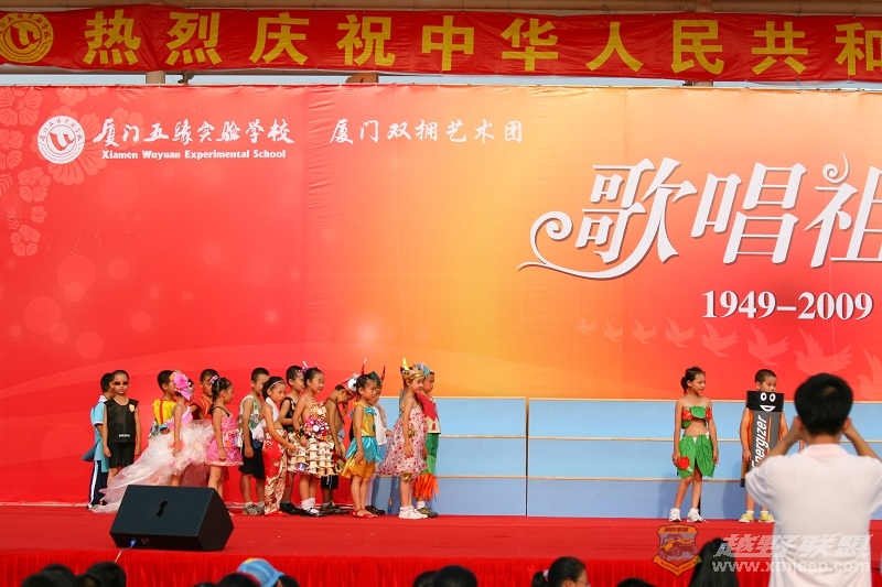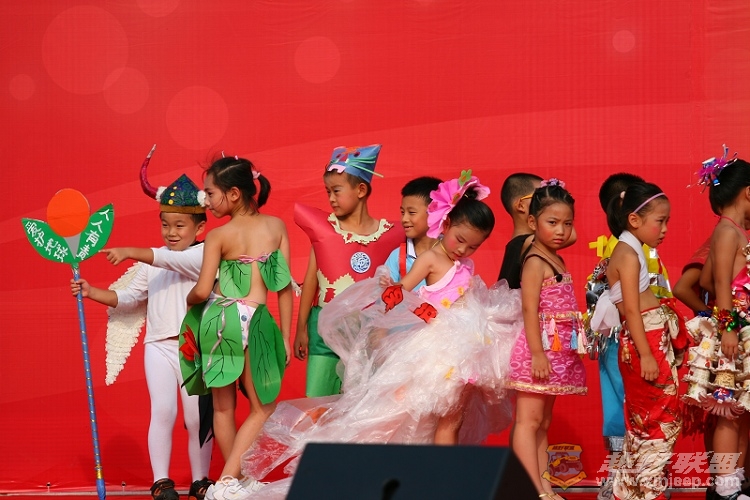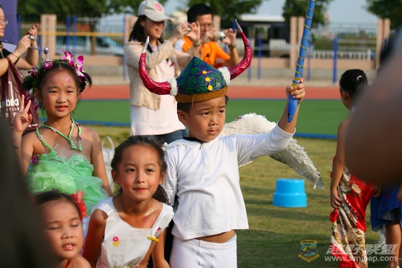 发几张孩子参加学校国庆活动的照片.这些孩子身上穿的全是家长们自已动手做的走秀服装.这次我偷懒,懒得再动手做了,就将原来他在幼儿园时帮他用旧报纸做的魔牛帽和从球馆打球时捡回来的废旧羽毛球做的天使翅膀让他穿了起来杂配了次"魔鬼与天使",害他掉眼泪不想穿,结果老师们都夸他好可爱,他也就不再嘀咕的穿去表演了.