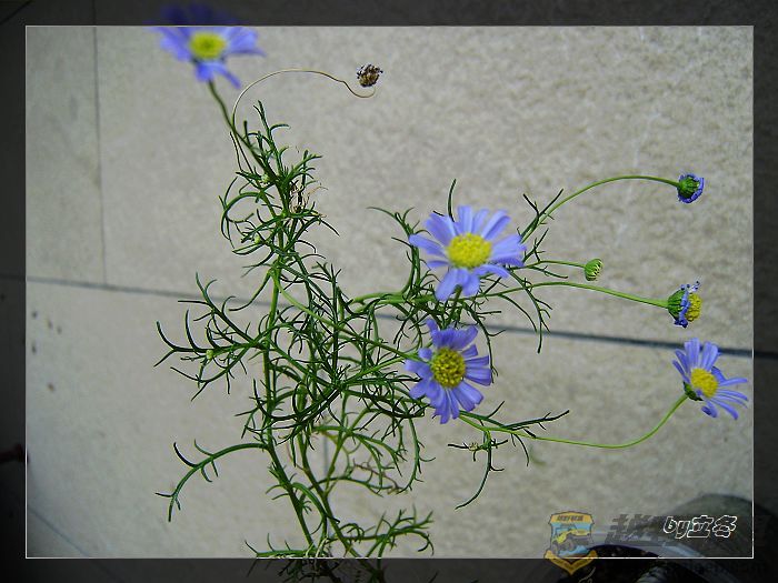 花为友给的五色菊开了,蓝色的花很可爱,可是植株细细弱弱的,不知可否挨得过酷暑