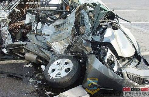 崭新的飞度被中巴撞上并向前推行了近百米后已变成一堆烂柴一样的散件,惨的是驾车人不是被撞身亡而是被弯曲的零部件扎伤毙命的,仔细看的话可以看到驾驶位后方弯曲着的三角形钢梁尖端直指驾驶员所在位置。。。据当时近距离观察,驾驶人只在太阳穴处有一核桃大的伤口。