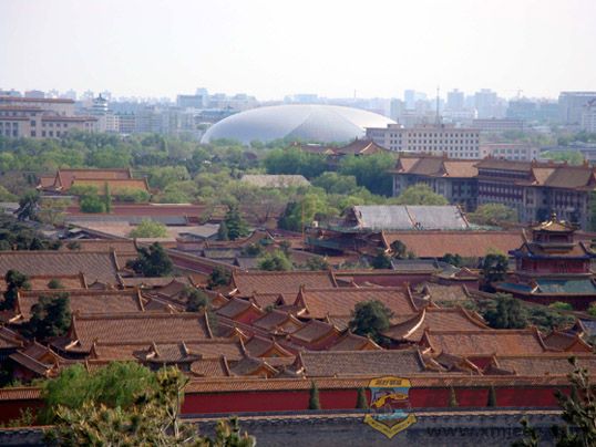 从景山远眺故宫建筑群与巨蛋--国家大剧院