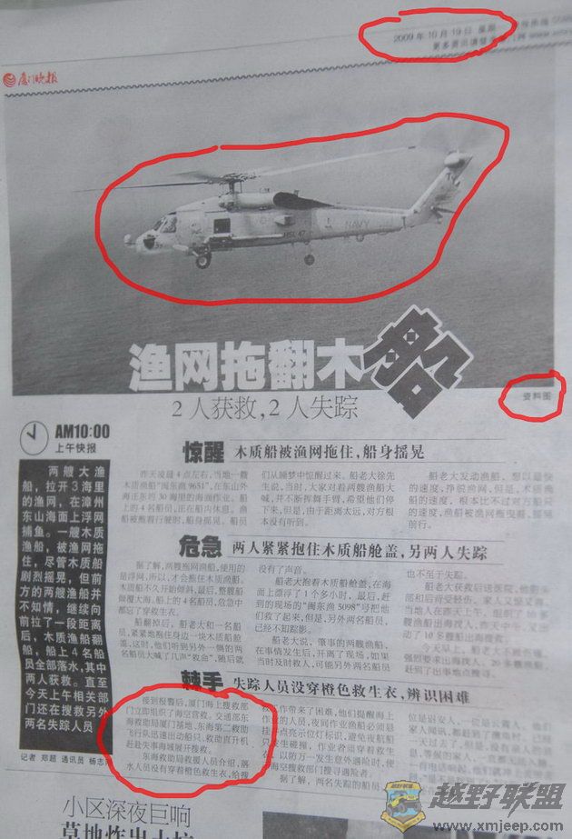 3 D( `9 r" t! g: l. ^www.xmjeep.com发这个帖子并无攻击晚报的意思,只是希望以后稍加注意。图片用错也许一般没什么大事,可弄个US NAVY的还好,要是不小心弄个青天白日机徽的呢?放在10年前,这可是个大事。刚认出是SH-60的时候,我还以为事发TW海峡,TW方面也排除救援飞机参与搜救了呢。。。。。。。。:lol