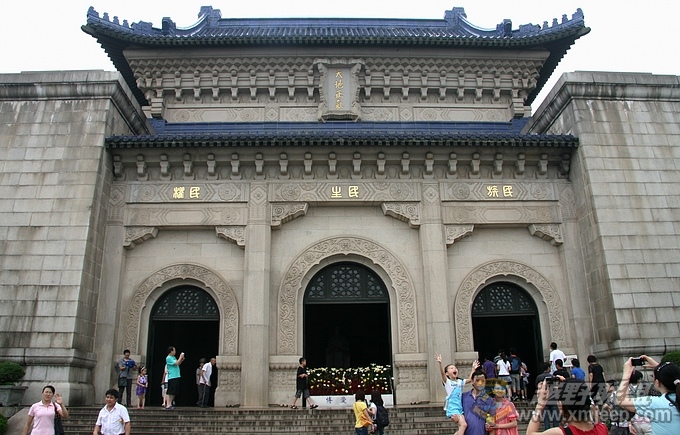 中山陵坐北朝南,其中祭堂为仿宫殿式的建筑,建有三道拱门,门楣上刻有"民族,民权,民生"横额。祭堂内放置孙中山先生大理石坐像,壁上刻有孙中山先生手书《建国大纲》全文。