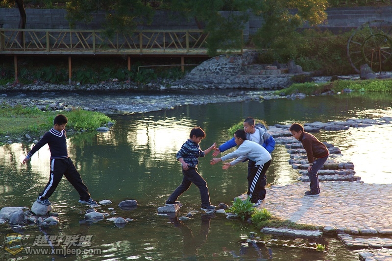 一帮男孩子踩石头过河玩得不亦乐乎