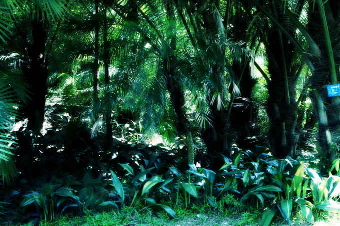 热带植物区水雾弥漫,斑驳的阳光照射下如同仙境
