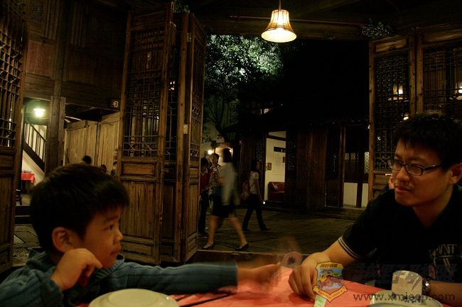走完情景长廓要坐船到达对岸进入景区,坐在船上,刚中秋过后明月清朗高挂相伴,船窗外景色温婉怡人,好一幅江南水乡夜色画卷,赶紧掏出相机,准备拍照,无奈船儿是船工划浆摇摇晃晃,又是夜晚,无法拍照.下了船后,将三脚架打开装上相机,打算拍此夜景,却发现时间紧迫,用三脚架太麻烦费时,又即收起来,免得老乡等太久,可是掐着时间在游玩.