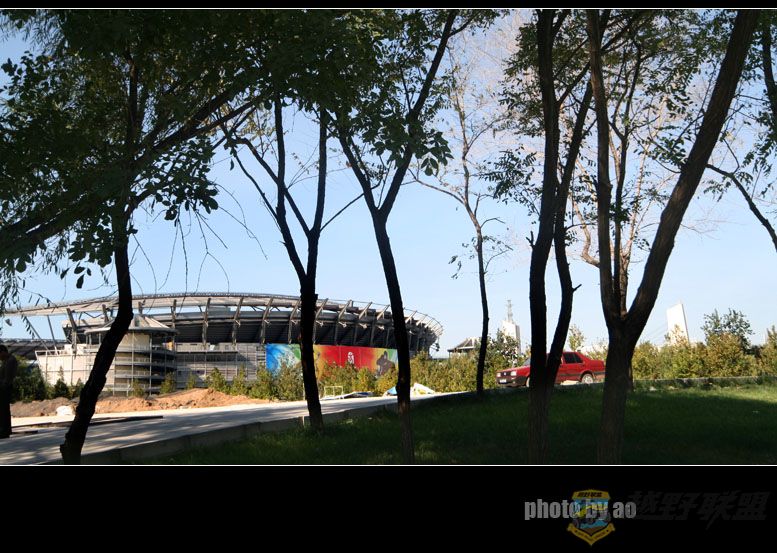 ; W4 E$ m: k: {0 E# P进入北四环,便来到了北京奥林匹克中心,可惜奥体中心被关闭了,到京所有的游客都被导游拉着去看鸟巢和水立方,奥体中心显得冷冷清清,只有一个小家庭在场馆外的花带边拍照,剩下的就是我围着奥体中心打转转了,想硬闯大门给赶了出来,想从工地的棚缝中钻进去又被工头逮了出来,偶地娘哎,只好隔着栏杆门缝里小瞧一下下了:L