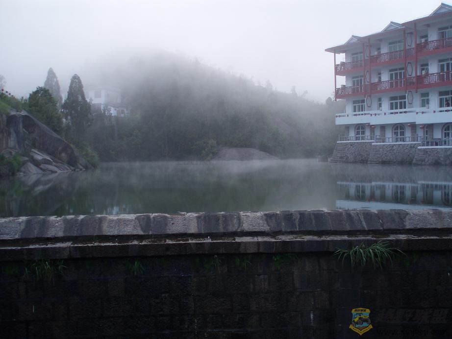 ) t! S# a; c7 W) @% }: r+ G" t玉湖宾馆前的湖面上一层淡淡的雾