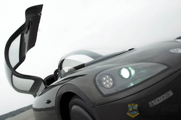 4 c0 w2 C$ Q& R' \. V1升车采用双氙头灯,仅32瓦特,效果却等同于传统的60瓦特头灯。整个头灯元件都由聚碳酸酯制成,重量仅仅有1500克。日光灯,所有的转向信号灯以及后灯簇都采用了LED技术。车内照明也同样采用LED,当在晚上打开车门时还会有电致发光金属片提供必要照明。更多的技术则展现在摄像系统中,该系统有自动识别功能可自动的解锁鸥翼车门以及点火键。车内采用了整洁,运动的设计能为2个人提供足够的空间。塔式的玻璃车顶由聚碳酸酯制成并有防紫外线功能。座椅采用镁金属结构以减轻重量。后座乘客可以很舒适的将脚放在位于驾驶位2旁的脚凳上面。驾驶员面对的是一个平顶的方向盘,座舱的风格就好像置身于一台喷气式飞机上。中央圆形仪表的左右2边是2台显示屏提供后视图像,在前面右边控制台上的是换档开关,电子手刹开关以及启动键。左边控制加热,通风以及车内灯照明。