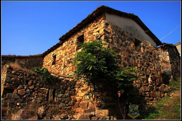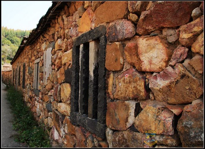 村里非常安静,是那种乡村特有的安逸宁静。沿着村中小道漫步,随处可见宽宽窄窄、纵横交错的小巷和高低错落的石阶,小巷古朴幽静,石阶延伸处与一座座民居相连,引人入胜的是这里的小巷、石阶和民居均是用规则不一、形状不同、五颜六色的山石砌成,一座座石屋,饱经沧桑,已显得斑驳殘破,但仍然默默的沉静在这里,似乎向人们展示着它所承载的历史。有意味的是,小道边一座古宅,曾被用白灰涂抹过,尤其醒目,门庭的两侧书写着两条**语录,记载了那个特殊年代的印记。村子不大,没有那些著名的古建筑群的壮观,也没有传说中的如油画般神奇的美丽,但那色彩斑斓、灼灼夺目的古石屋古色古香,也堪称一绝。