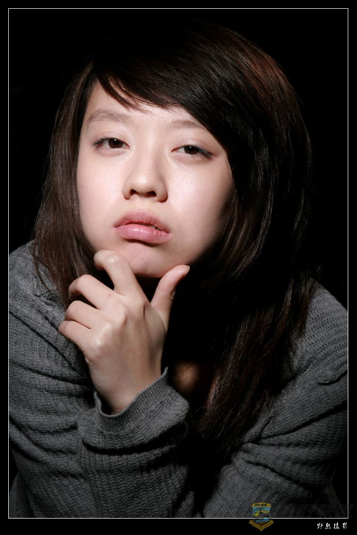采用黑色背景,主光用一盏加了聚光罩蜂巢网的硬质闪灯,右后方一盏加了蜂巢网的闪灯,打亮身体和头发以便主体和背景能分开。说实话,这个布光方式并不合适拍MM,呵呵,感谢MM的配合,拍得挺辛苦。