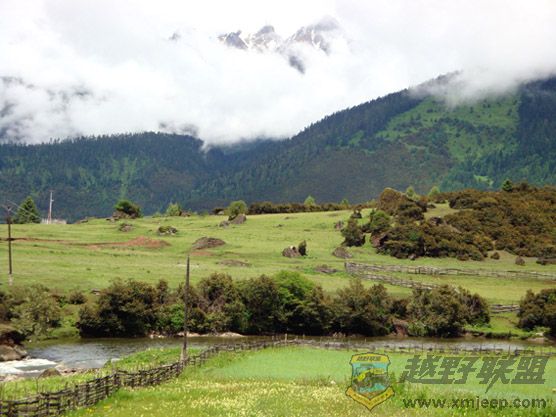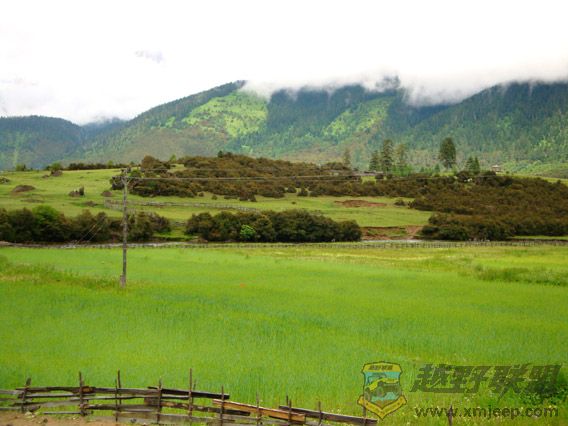 % [ ~. {$ \0 v6 p鲁朗林海的观景台就建在国道边,停车观林海,尽管贵为色季拉国家级森林公园,但景色稍嫌单一,“世界植物博物馆”的美誉我等“木头(此处请用闽南话念)”们又看不懂。加之是阴天,也就无法看到南迦巴瓦峰了。山下的牧场,野花也不够缤纷。据说,等牧场完全建好后,门票将是一百四十元,我闻言为之咋舌。川藏线上随处可见牧场,那里花儿更盛,景色更美,而且不收费。这不,在鲁朗镇外,一处路边美景闪现,我忙叫次仁司机停车,大家一呼拉全下车拍照欣赏。翠绿的青稞田园中,一位红衣女子正在劳作,蓠芭墙外环绕着淙淙的小溪,湛蓝的天空下,洁白的雪山浮在一层白云上,美不胜收!最美的风景真的是在路上!