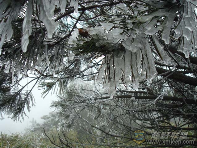 慢慢地,路边的九仙松、毛竹等植物的叶子上开始出现雾淞。晶莹剔透的冰霜或凝结或包裹着翠绿的松针和黄绿的竹叶上,满树冰花玉挂,更显冷艳清峻,动人心魄。阵阵浓厚的雨雾刮过,漫山飘渺,宛若仙境,不愧为得道的仙山啊!