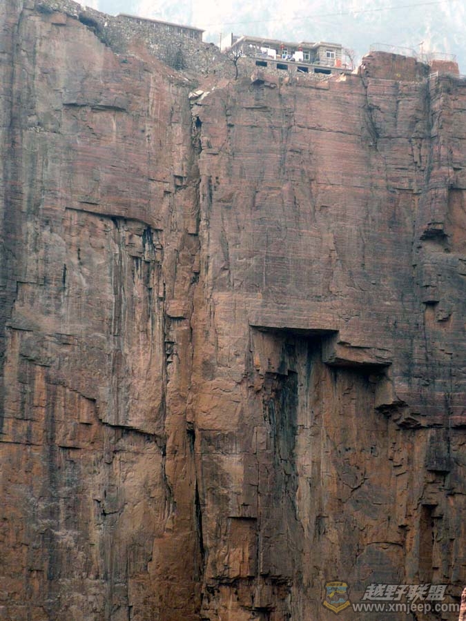 : C& r; K4 M* u& Z. ^4 ?7 ^搞定住宿,就在村里闲逛。郭亮村位于太行山山峰上的一块台地上,四周环绕着更高大的山峰。郭亮村的民居都是就地取材,全都是用当地的石头建成,外观是典型的北方民居式样,屋顶有天台,天台四周用砖砌了一圈镂空的围栏。沿着崖顶公路散步,旁边就是悬崖,探头往峡谷下看,太行山的惊险奇绝让俺双腿发软。只有身临这铜墙铁壁般的太行山,才能更好地理解当年抗日烽火为何能在太行山上熊熊燃烧。山风掠过,山谷间似乎仍回荡着中华民族壮怀激烈的战歌: