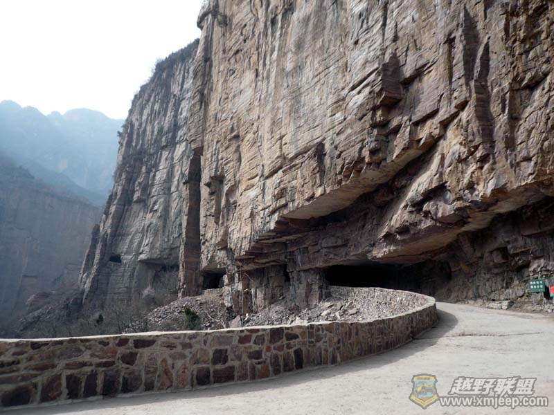 - v7 t+ F/ ^8 S2 b% i走了不久,就看到山路正前方出现一个黑黝黝的**嘴似乎的巨大山洞,著名的郭亮村绝壁长廊公路到了!自古以来,困守太行山顶的郭亮村人出门只能通过近乎垂直的天梯,不方便且极危险。1972年,郭亮村党支部书记申明信带领村里的其他12名勇士,用绳子绑着身体,从几百米高的山顶悬到峭壁的半空中,打烂4000把八磅铁锤,消耗12吨六棱钢钎,村里的羊、大树全部卖光,一位年仅三十来岁的生产队长王怀堂甚至付出了生命。经过六年的苦战,他们终于在太行山坚硬的山体中打出一条长1300米,高4米,宽6米的隧道。愚公移山只是传说,郭亮村的绝壁隧道却是真真实实的动人风景。郭亮村前辈先人这种战天斗地的奉献牺牲精神,永远值得我们敬重!