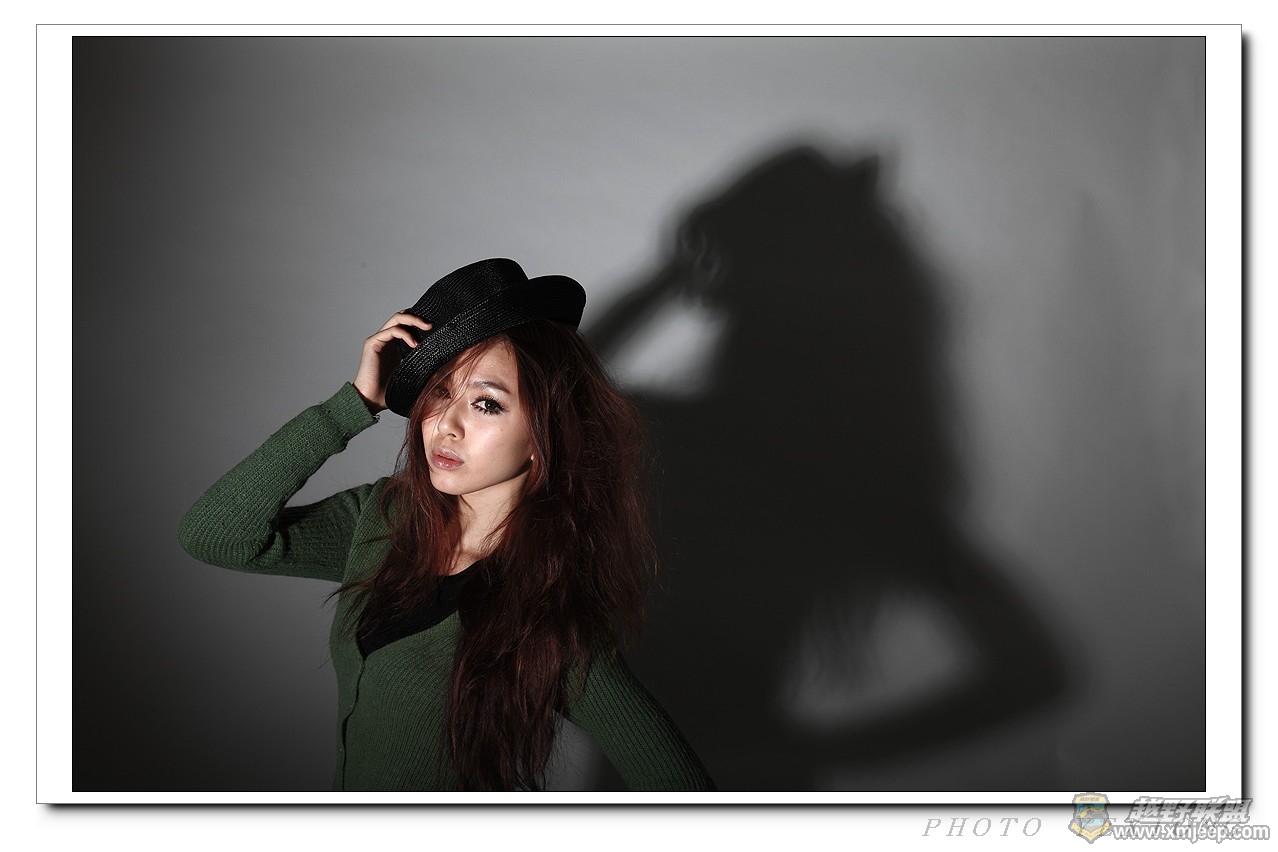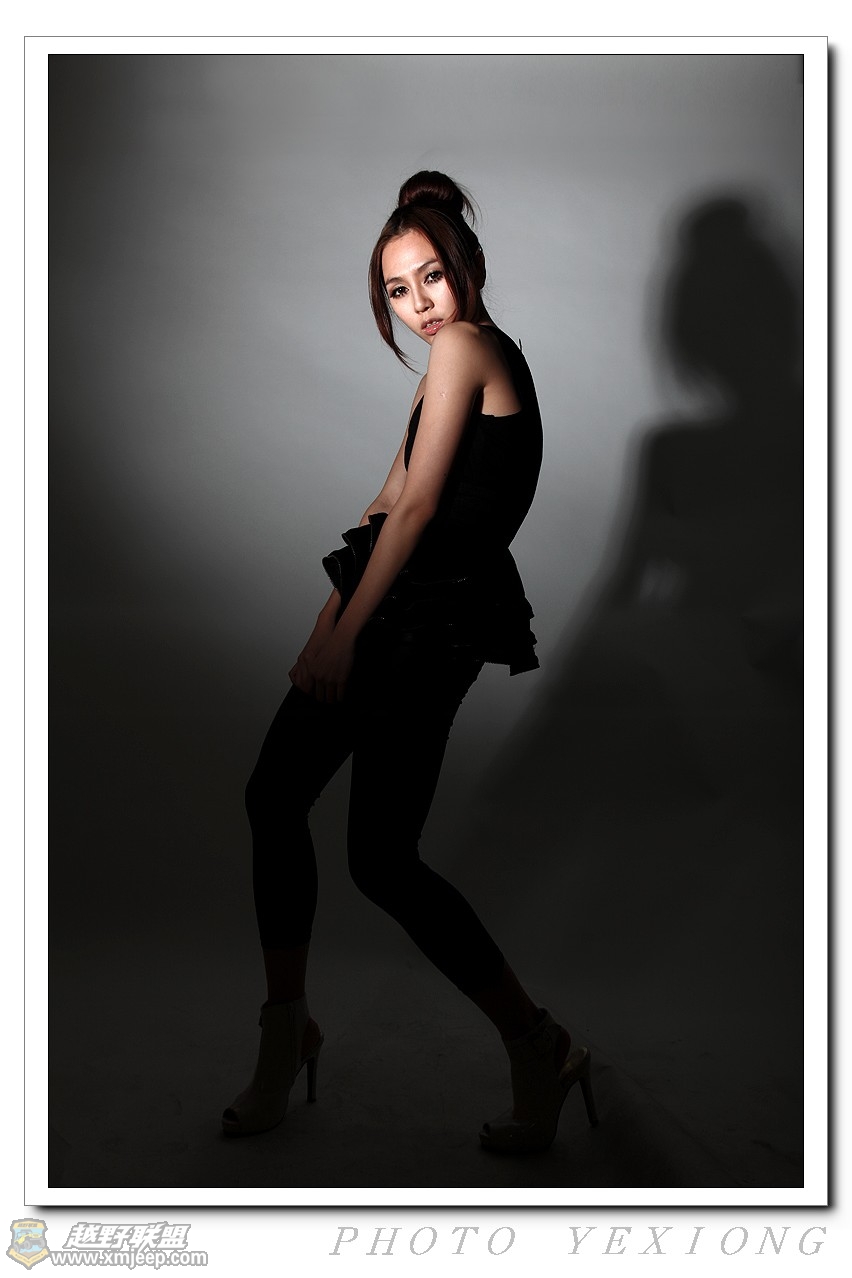 这组照片只用了一盏灯,而且是用标准反光碗,加了蜂巢,出来的光质很硬,特地放低灯位,让人物在背景上有个大黑投影,想试试会产生什么效果。