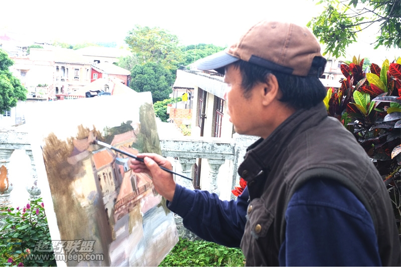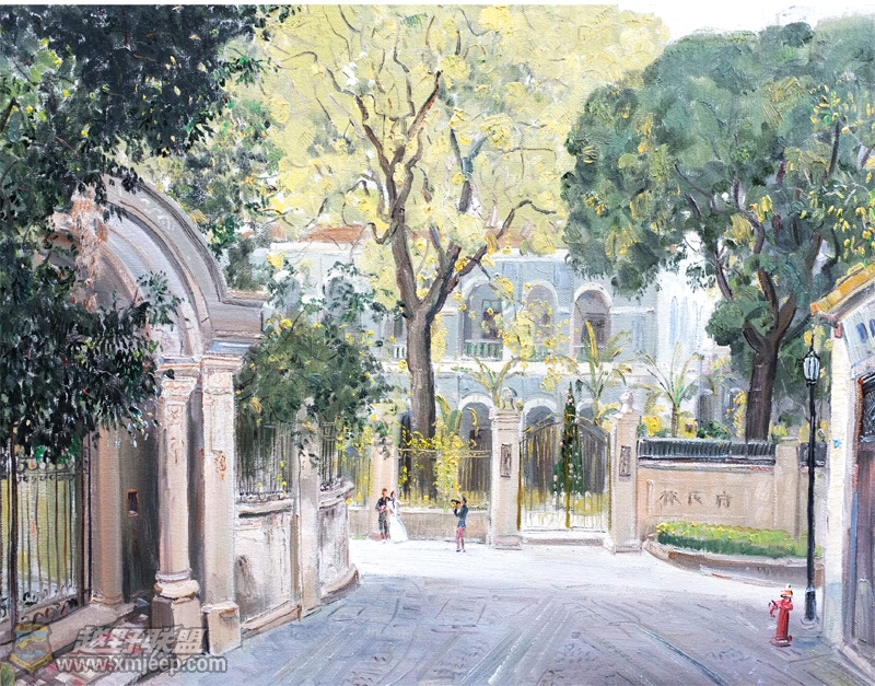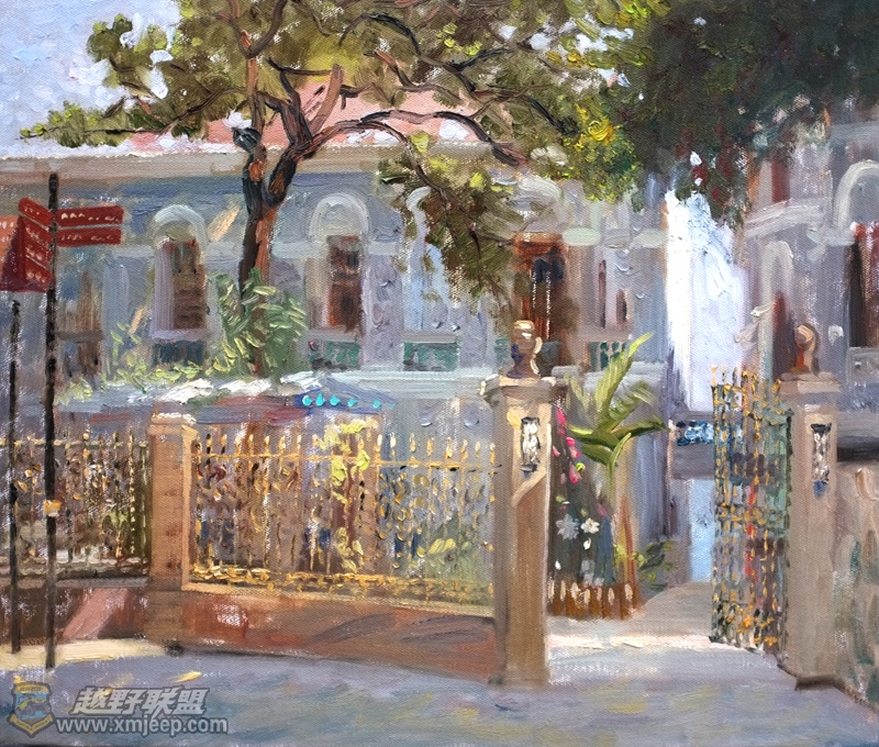 读着他写生创作的鼓浪屿系列作品,我被震撼了。传奇的色彩,气派的构图,每一处细节的关注都浸淫着他一笔一画的艺术修养,读他的画,仿佛进入了一片梦幻世界,色彩与阳光在树林和小草之间昵语;童话与小鸟在房顶和鲜花之间编织;黄昏与晨雾在天堂般的乐曲中悄然结盟……你几乎不得不与他一起分享艺术创作的快乐,不得不被他的艺术内涵所震撼。当然,这一切的描绘,是基于他几十年的写生,几十年对大自然的眷恋。当我们看到他一幅幅画得如此潇洒如此深情的油画,就可以读出他的内心,恬淡而优雅,纯净而浪漫。