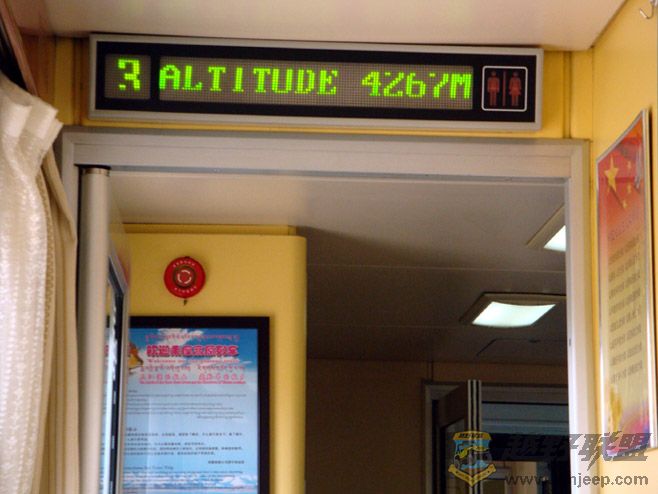 火车十二点准点发车。我们车厢的乘务员是一名家住西宁的汉族小姑娘,可能是跑多了高原,圆圆的脸蛋隐约染上了高原红。她笑容可掬地先用汉藏英三种语言自我介绍,然后特地介绍了高原列车的特殊吸氧装备。这种服务源自于航空,但我感觉这些乘务员比起空姐的职业性微笑更为真诚些,但愿她们的微笑能永远像洁白的雪山一样真诚。每节车厢过道上的小屏幕流动显示着火车此时的海拔高度、速度等。到卫生间一参观,卫生间里不但有水,而且居然还配备有卫生纸!青藏列车还真的是不一般!