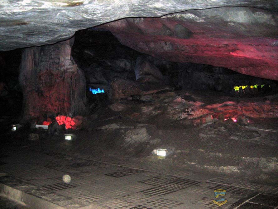 很快,仅几秒钟,眼前又豁然一亮,我们成功地通过水面的山底来到内洞。内洞与大多数溶洞大同小异,钟乳石的形状见人见智,比较出彩的是洞内两段高约二十米的大瀑布。瀑布水量相当大,水声哗哗,水汽喷溅,好似齐天大圣的水帘洞。