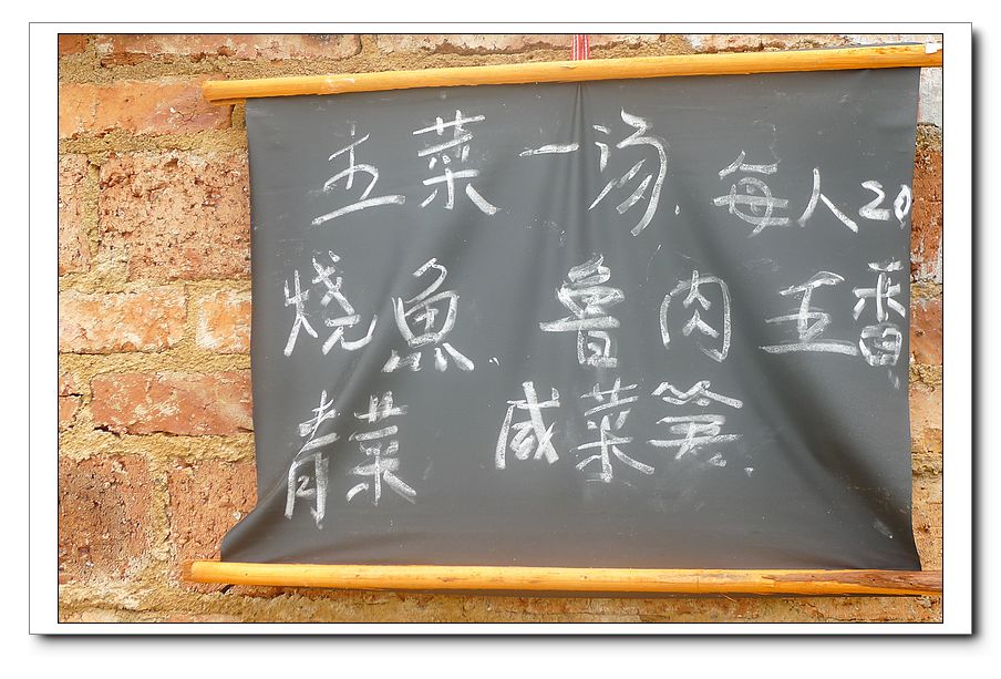 中午,吃饭的地方将阳光大侠预定十二点吃饭的时间听成下午两点,很多人狂晕,不过出来玩所以开心就好,也就无所谓了。不过我们还是提前一点多钟就吃完饭了。伙食五菜一汤,一人二十元,二十三大人十三小孩,老板收我们二十四个人的钱,心里那个安慰啊。。。。。。。。。。。。。。。。米饭煮的不太好吃,菜的味道还不错,不过可能大家也饿了,所以胃口都很好。。。。阳大侠之前的贴子里说村民很纯朴,这次真的感受到了,纯朴而好客。。。。。。