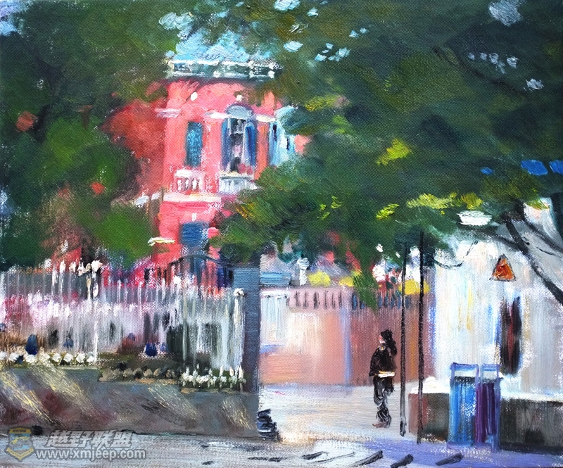 2 ?0 q# E. a/ @7 T: T. ]读着他写生创作的鼓浪屿系列作品,我被震撼了。传奇的色彩,气派的构图,每一处细节的关注都浸淫着他一笔一画的艺术修养,读他的画,仿佛进入了一片梦幻世界,色彩与阳光在树林和小草之间昵语;童话与小鸟在房顶和鲜花之间编织;黄昏与晨雾在天堂般的乐曲中悄然结盟……你几乎不得不与他一起分享艺术创作的快乐,不得不被他的艺术内涵所震撼。当然,这一切的描绘,是基于他几十年的写生,几十年对大自然的眷恋。当我们看到他一幅幅画得如此潇洒如此深情的油画,就可以读出他的内心,恬淡而优雅,纯净而浪漫。