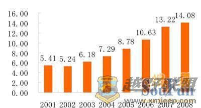 4 h( Q% `: p1 f( W# r* e+ e2 P, F很明显,厦门房价收入比的走势与上述房价的走势非常同步。03年之前房价收入比非常合理,与全国水平相当。04年之后持续上升,07年一跃超过13倍,泡沫比较明显。08年价收入比超过14倍,这在全国各大城市当中,是最高的,泡沫比较严重。