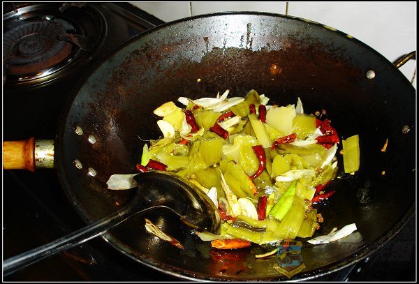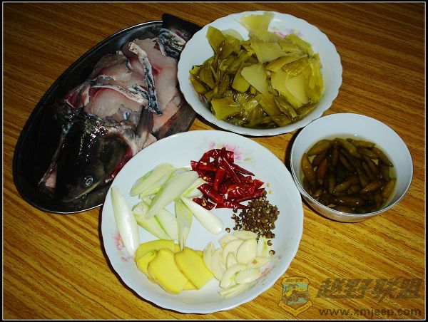9 T: N, Y0 v* D E: ]+ T, u厦门越野联盟 3、将炒好的酸菜倒入汤锅,加水烧开放入鱼头、鱼骨、野山椒。