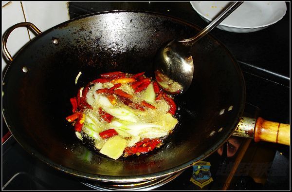 H' \! g7 G h/ {. K 1、起油锅(油100克),待油温5成热时将调料倒入锅中翻炒。
