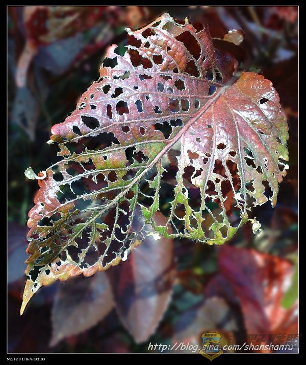 深秋,街边的植物已经开始变色、凋落,有的甚至被虫吃的只剩下叶脉,可它们却呈现给人另一种美……