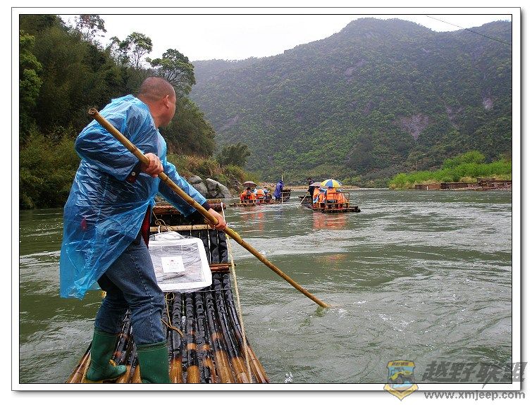 下山后,开始今天的重头戏,竹筏漂流。迎着蒙蒙细雨,四张竹筏一字排开,顺流而下,坐在竹筏上悠然自得地欣赏着两岸风光。听说如果夏秋季节到来,两岸连片绽放的芦荻,或白洁或粉红,在青山绿水的映照下,在古桥老屋的衬托下,说不尽的诗情画意,可谓是: