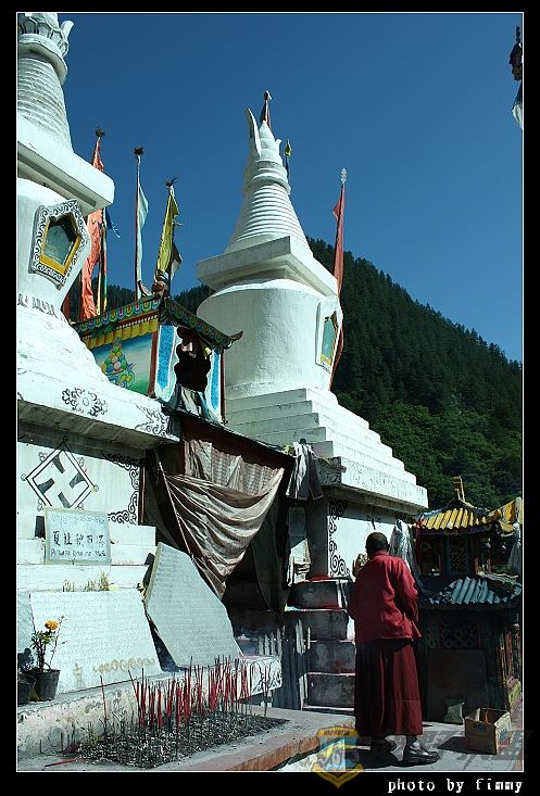 村寨前有一排白塔.一个喇嘛.向所有过来的旅客发拜拜用的香.8 t9 {: G* p' U& X! N