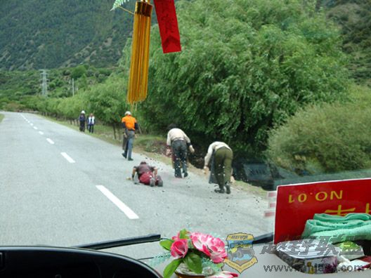 继续翻越色季拉山。随着海拔越来越高,车上不少人出现了头疼等高原反应。就在此时,路边出现了三个正奋力蹬车的车友,其中还有一个是瘦小的女生呢。我忙以此为榜样,为我们车上这些高反的同伴打气。想当年,俺也是幻想着骑车进藏的,唉,俱往矣,年岁见长,豪气渐无。在鲁朗镇,几辆风尘仆仆的摩托车停在我们吃饭的店外,摘下头盔,居然是几个老外,有一个也就十五六岁的模样。这些进藏的自行车手和摩托车手们,都是好样的!而更好样的则是不时出现在我们车子旁边的叩长头的虔诚信徒们!他们从青海、四川、云南等地出发,三步一叩首,以等身长头叩向拉萨。这种对信仰的忠诚与付出,着实令我为之叹服!