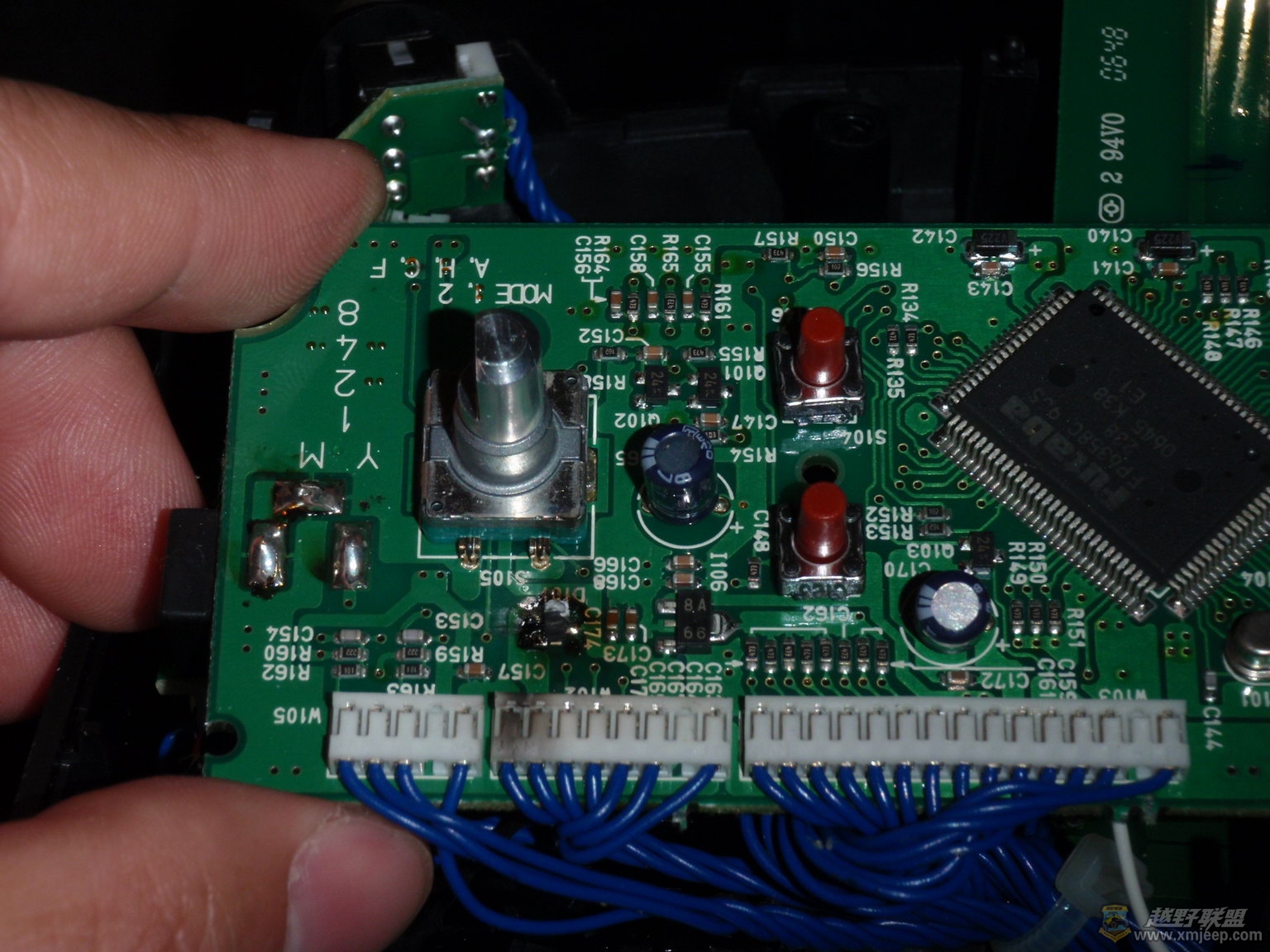' f& {0 @# V; T7 h找到了问题,解决起来也就简单了。从一个报废的56K猫上拆下一个设计电流为0.5A的贴片肖特基二极管,换上,上电,开机,搞定。一切正常。为了防止该类事件再次发生,我在锂电的输出电源线正极上,又串入一个1N4004二极管,将输入电压先行压下0.7V后再输入遥控器,开机再看,遥控器显示电压11.4V,安心了。