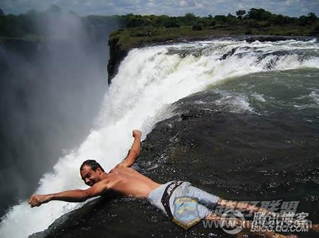 6、在360英尺(110多米)高的维多利亚瀑布顶部是一座天然的岩池——“魔鬼池”。每年9月到10月,水池的水量相对较平静,人们可以在池中游泳。这副照片势必让你有点小紧张,或是毛骨悚然。