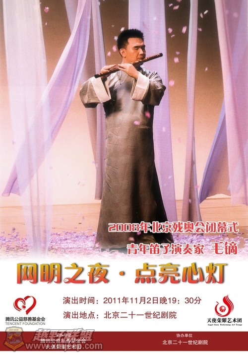 6 p4 v% f+ ^9 b& Y$ B" x# w. y G 天使荣耀艺术团成立以来,进行了许多公益演出。我作为唯一一名随团摄影记者,每每泪眼模糊,忘记了拍摄任务。但忘不了3.8国际妇女节这天,第二届“科学与艺术”活动组委会特别邀请中国唯一的盲人芭蕾舞演员赵蕴辉,在全国政协礼堂为全国两会代表作精彩演出《睡美人》和《舞姬》,那美轮美奂的表演让全国政协副主席王志珍称赞不已,一向学习极为刻苦的赵蕴辉顾不上吃饭,就带着疲惫,连夜赶回天津上学;忘不了宝马携手天使荣耀艺术团长城公益行活动,孩子们圆梦长城,把心愿祝福卡系在鸽子腿上,放飞起自己的梦想;忘不了北京木马剧场《情若满弦·30年经典中国风》,以最古雅的传统民族乐器与演唱,演绎经典的“中国风”,盲人钢琴家金元辉自弹自唱《其实你不懂我的心》比原唱更能打动人心,毛镝排箫一曲《橄榄树》,人们仿佛能从每个音符里听到呜咽的声音,这场他们自己只编排20多天的音乐会,却给人们带来那麽多纯美的时代经典记忆;忘不了为腾讯员工作“精彩生活·分享爱”的专场演出,感动、感恩、感佩、感叹···现场的每一个观众都进行了一次心灵的洗礼,那纯美的艺术享受和美妙的生命改变必将植根到每个人的心底。