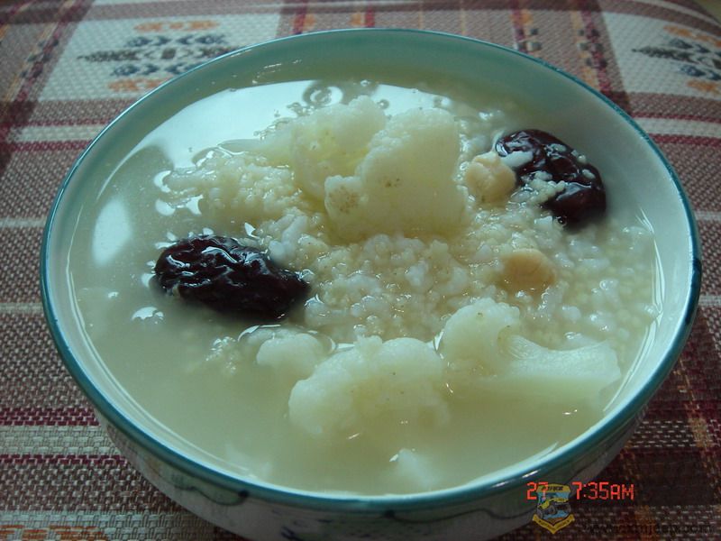 这是偶发明的一种粥的煮法,小米是养胃的粗粮,但是单纯煮,象是东北的吃法,加上一点大米,口感更好,偶早餐一般是小米+大米粥+红枣,炒一个青菜,一个水煮蛋.