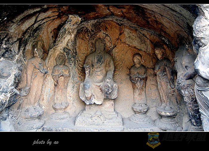 ; H8 Y1 G; b+ F7 g+ m4 r- m 宾阳北洞始凿于北魏,完工于唐高宗时期(650-683年),主尊阿弥陀佛,火焰纹背光繁杂而生动,洞口南侧“龙头”柱础属北魏作品。