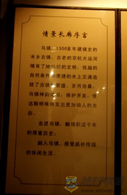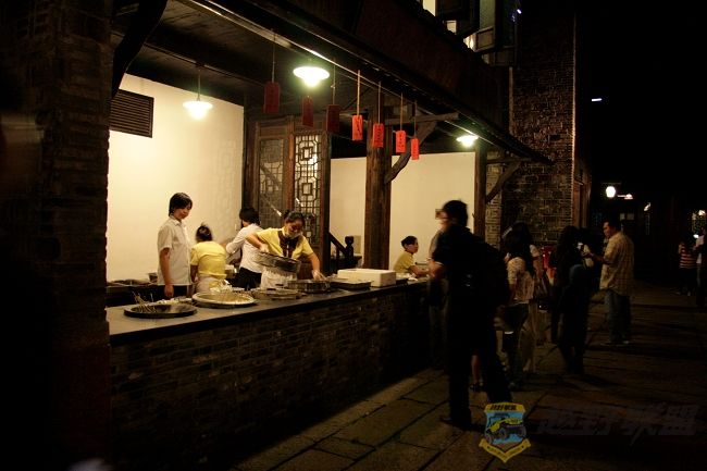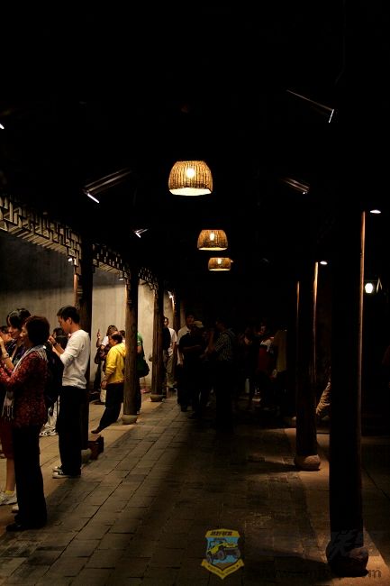 走完情景长廓要坐船到达对岸进入景区,坐在船上,刚中秋过后明月清朗高挂相伴,船窗外景色温婉怡人,好一幅江南水乡夜色画卷,赶紧掏出相机,准备拍照,无奈船儿是船工划浆摇摇晃晃,又是夜晚,无法拍照.下了船后,将三脚架打开装上相机,打算拍此夜景,却发现时间紧迫,用三脚架太麻烦费时,又即收起来,免得老乡等太久,可是掐着时间在游玩.