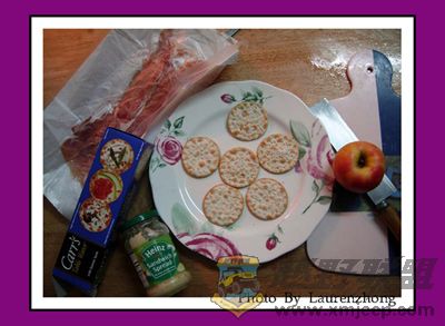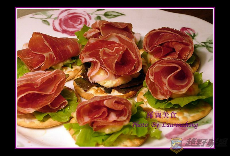 把沙拉叶子卷成小片,铺在饼干上面,注意不要卷得太大,要比饼干小一点。* A4 ?- e$ W# y+ T1 o