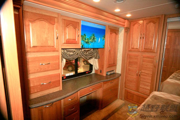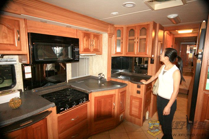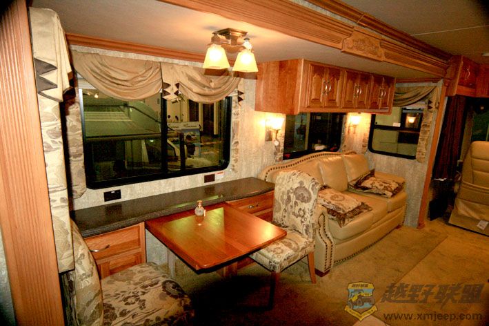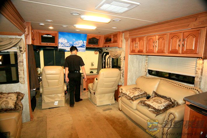 这台房车比较有意思,是美国原装进口的,停车时两边象抽屉一样可以向外伸出,增加了空间.