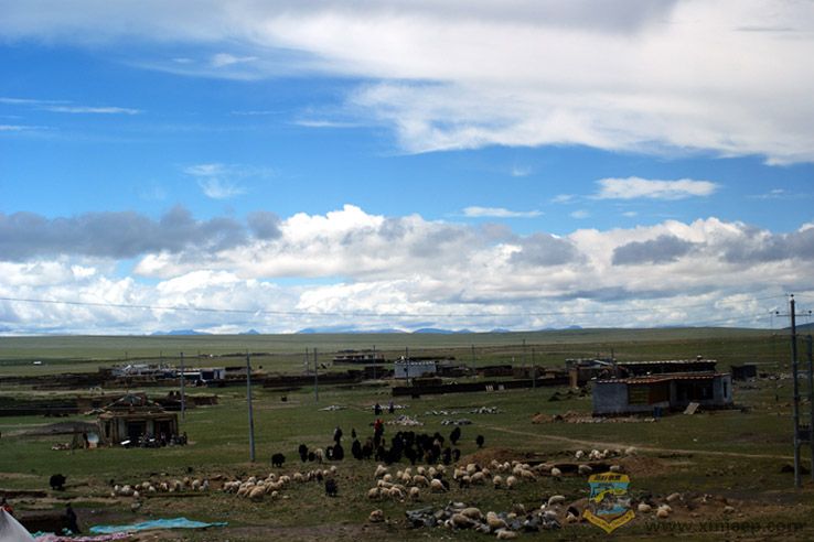 & j% f- k; u( w+ c1 B1 A1 }! j! S" B T青藏铁路建成三年后,我有幸坐在青藏列车上,从拉萨出发,高歌“坐上火车离拉萨”。窗外,藏北无限风光尽展眼前。过了当雄,天路们就一头扎进藏北高寒草原,也叫那曲高寒草原或羌塘草原。藏北草原,人烟稀少,水美草丰,是动物们的乐园。一路上,厚重的草垫上散布着黑的牦牛,白的羊群,褐的马儿,绿草毯一直漫延着爬上缓坡,触摸到雪山的白帽子。雪山的融水,汇成了大草原上小小浅浅清清的河流,极尽曲线地妖娆。青藏高原的雪山融水也造就了中国最密集的湖泊区,小的水泡、池塘,大的海子、湖泊,如明亮的珍珠撒满绿色的藏北草原。